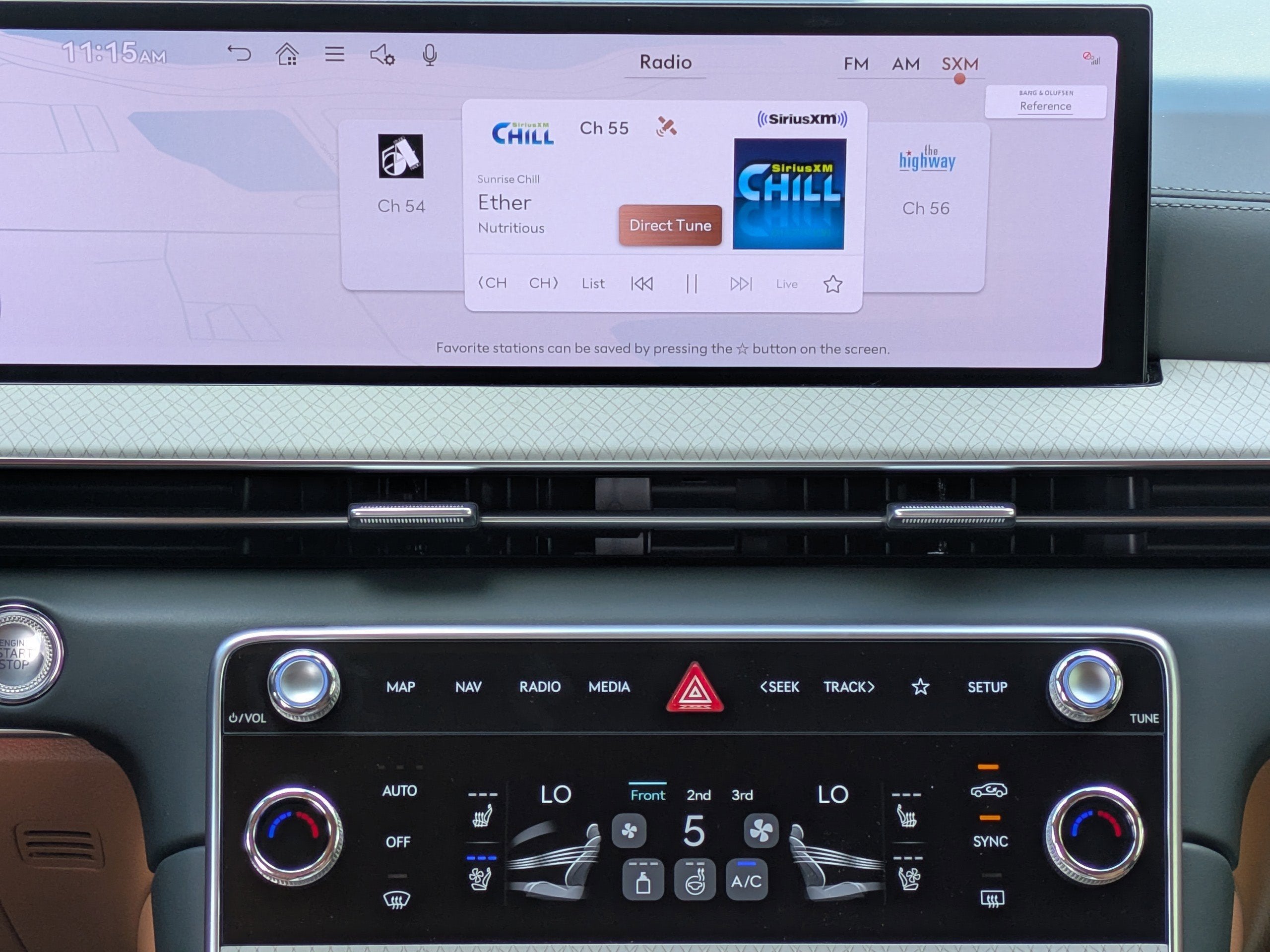 - Radio: AM/FM/HD Bang & Olufsen Sound System -inc: 1400 watts, 18 speakers, 14 channel amplifier, 27" integrated OLED instrument cluster and navigation system, SiriusXM Radio w/90-day subscription (not available in AK or HI), cloud connected platform (cloud profiles, connected routing, dynamic voice recognition, OTA updates), wireless Apple CarPlay, wireless Android Auto, Bluetooth® hands-free phone system w/audio streaming, wireless phone charger, Wi-Fi hotspot, steering wheel controls, USB and Genesis Connected Services