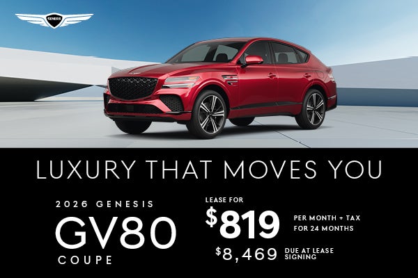 ALL OFFERS WITH APPROVED CREDIT AND EXCLUDE $750 ACQUISITION FEE, TAX, REGISTRATION, LICENSE, $778 DEALER SERVICE FEE, ADDITIONAL DEALER OPTIONS. 2026 GV8O COUPE SELECT AWD LEASE BASED ON MSRP $52,925 FOR 24 MONTHS, 7,500 MILES PER YEAR (25 CENTS PER MILE THEREAFTER) WITH $8,469 DUE AT SIGNING. SEE DEALER FOR COMPLETE DETAILS. SOME VEHICLES REQUIRE QUALIFICATION FOR VALUED OWNER COUPON OR COMPETITIVE OWNER COUPON. NO SECURITY DEPOSIT REQUIRED. ALL OFFERS EXPIRE END OF DAY 04/30/26
